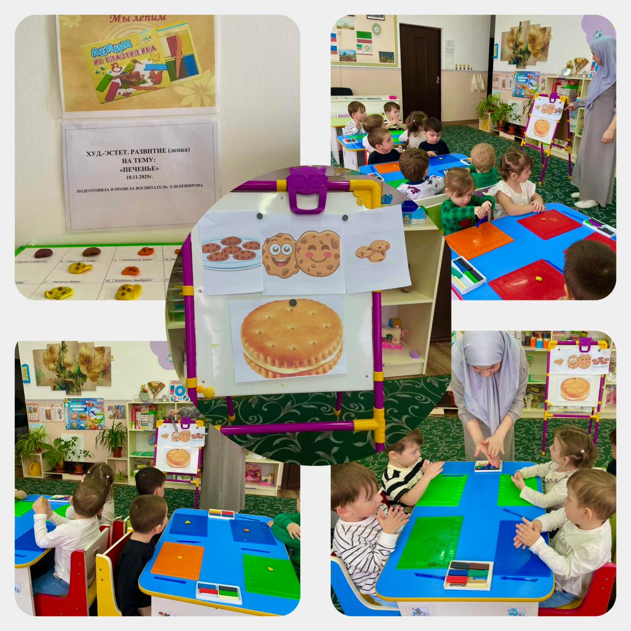 В МБДОУ «ДЕТСКИЙ САД» ИРС» «СТ. КУРДЮКОВСКАЯ» с воспитанниками младшей группы"Радуга”проведено занятие по”Художественно эстетическому развитию“(Лепка)на тему:"Печенье".Цель:развитие мелкой моторики, творческих способностей и навыков лепки у детей.